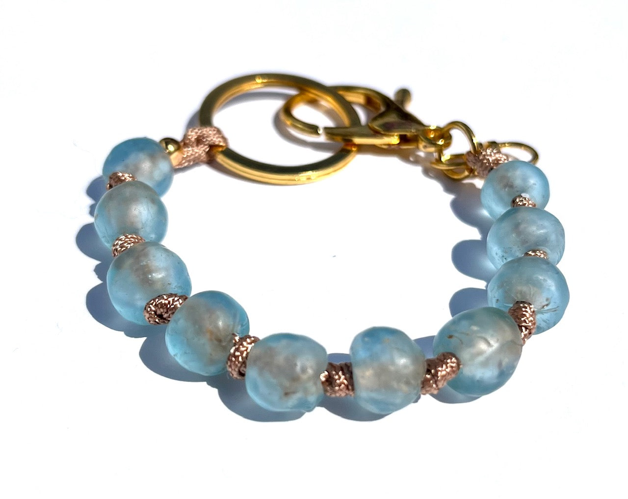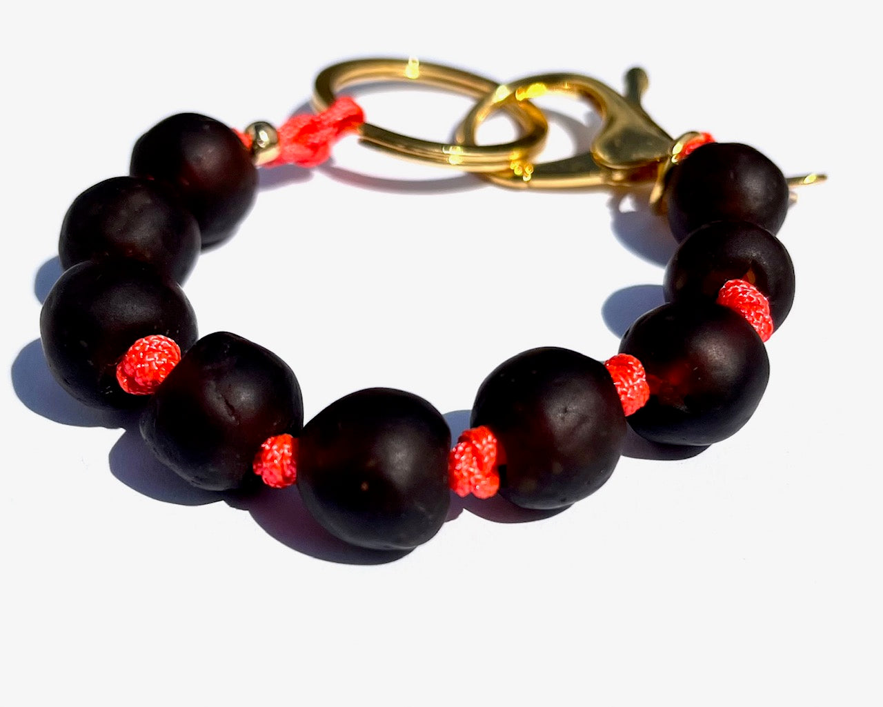 Our new Resort Wristlet is fashionably functional for day to day use. Attach your keys and wear as a bracelet on the go, or loop onto your purse or jeans. Hand knotted glass beads on nylon thread, choose from our many color ways!