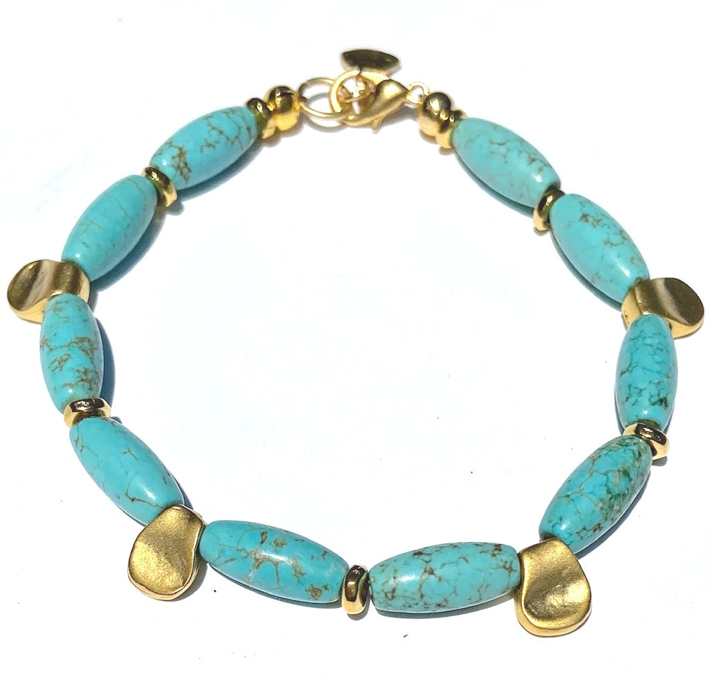 Our new Turquoise Pinch Bracelets are handmade using turquoise stone beads & 22K matte gold plated detail and closure. We've used stones that keep us dreaming of the sea.
